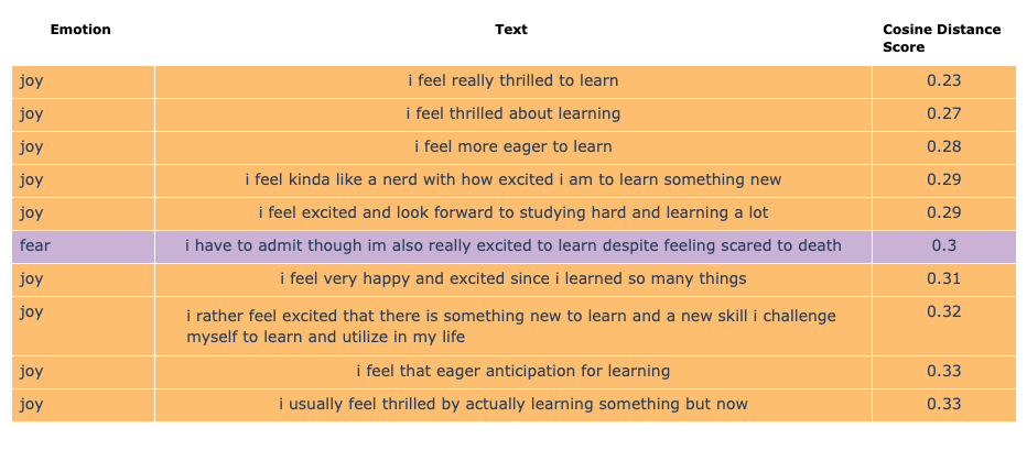 It is particularly noticeable that from the 6 emotions, only sadness has a strong semantic match with the text classified with the same label. As with full-text search, semantic search is affected by differences in document length (in this case the emotion keyword versus a text).